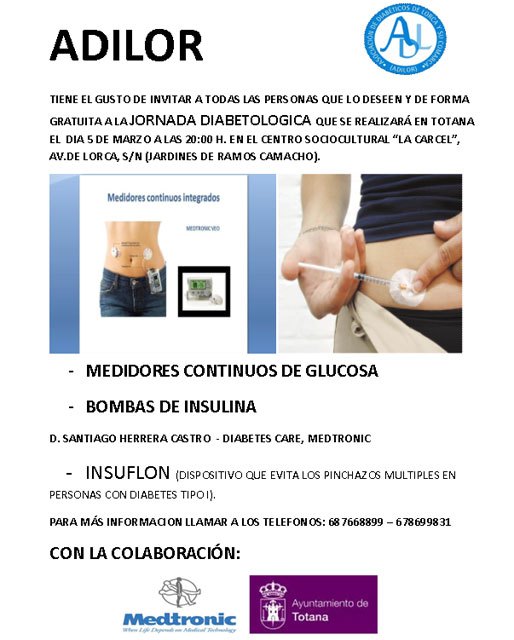 ADILOR tiene el gusto de invitar a todas las personas que lo deseen y de forma gratuita a la jornada diabetologica que se realizará en Totana el  día 5 de marzo a las 20:00 h. en el Centro Sociocultural “La Cárcel”