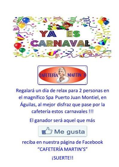 Cafetería Martin's regalará un día de relax para 2 personas en el magnifico Spa Puerto Juan Montiel, en Águilas, al mejor disfraz que pase por la cafetería estos carnavales