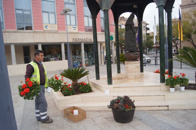 La Concejalía de Servicios y Mantenimiento Integral de la Ciudad está colocando nueva ornamentación floral en parterres y maceteros de los principales espacios públicos donde se celebrarán los actos públicos y procesiones de la Semana Santa de Totana.
