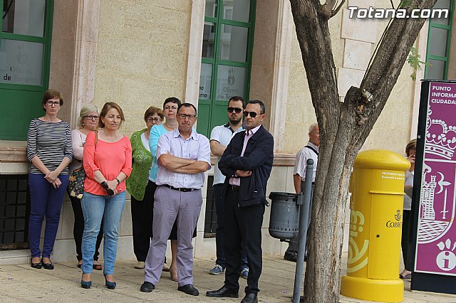 La alcaldesa de Totana, Isabel María Sánchez y la corporación municipal, así como trabajadores del Ayuntamiento guardaron un minuto de silencio a las doce del mediodía en la puerta del edificio Consistorial para expresar su rechazo a esta muerte violenta de Isabel Carrasco, que también era concejal del Ayuntamiento de León.