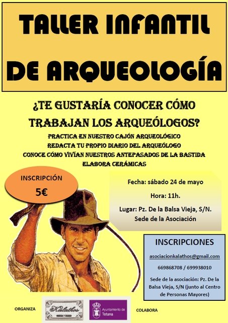 El sábado 24 de mayo a las 11h se realizará un "Taller infantil de arqueología" en el que los niños podrán conocer cómo desarrollan los arqueólogos su trabajo. Descubrir objetos de nuestros antepasados en nuestro cajón arqueológico hará las delicias de los más pequeños. El precio de esta actividad es de 5€ y está dirigida a niños de 8 a 12 años. Se celebrará en la sede de la asociación en la Plaza de la Balsa Vieja.