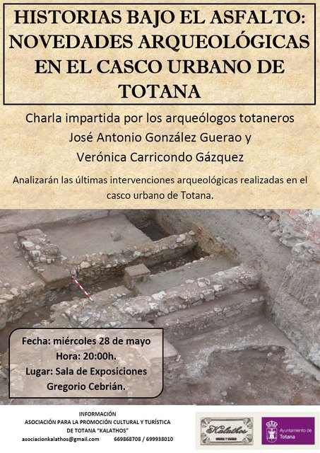 El miércoles 28 de mayo tendrá lugar a las 20h en la Sala de Exposiciones Gregorio Cebrián la presentación oficial de la Asociación Kalathos ante los medios de comunicación y cualquier persona que nos quiera acompañar. Seguidamente, dos arqueólogos totaneros impartirán la charla "Historias bajo el asfalto: novedades arqueológicas en el casco urbano de Totana", analizando las últimas intervenciones arqueológicas llevabas a cabo en la ciudad.