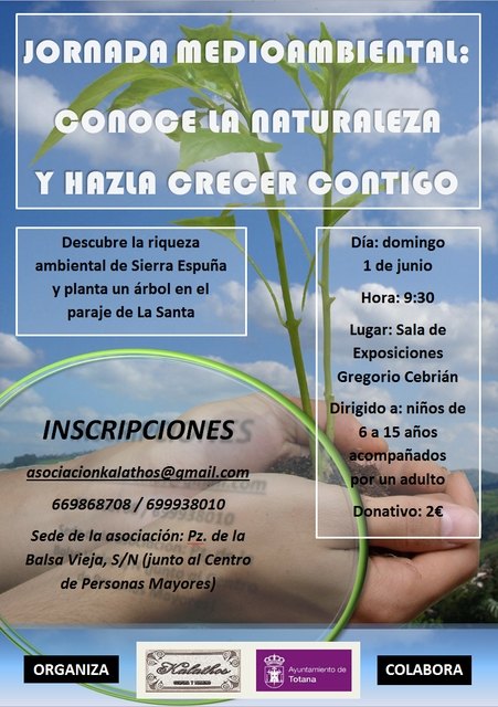 El domingo 1 de junio, con motivo de la proximidad de la conmemoración del Día Mundial del Medio Ambiente, los niños conocerán la riqueza ambiental de Sierra Espuña y posteriormente plantarán un árbol en el paraje de La Santa. La "Jornada Medioambiental: Conoce la naturaleza y hazla crecer contigo" comenzará dicho domingo a las 9:30 en la Sala de Exposiciones Gregorio Cebrián donde se impartirá una pequeña charla y posteriormente nos trasladaremos a La Santa a plantar los árboles. La actividad tiene un precio de 2€ y los niños (de 6 a 15 años) deberán estar acompañados por un adulto.
