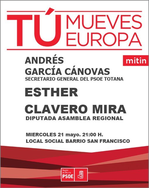 En el acto intervendrán Andrés García Cánovas, Secretario General del PSOE Totana y portavoz del Grupo Municipal en el Ayuntamiento, y Esther Clavero Mira, Secretaria General del PSOE de Molina de Segura y diputada en la Asamblea Regional.