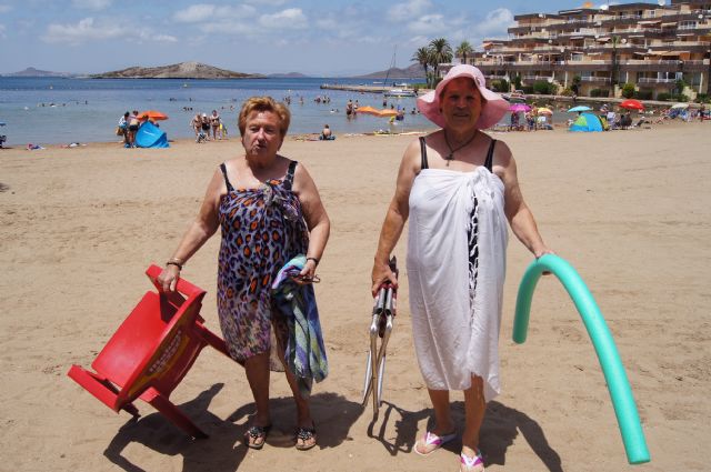 La alcaldesa de Totana, Isabel María Sánchez, y la concejal de Sectores Productivos, María José Baeza, han visitado a las personas mayores que participan en el programa municipal de viajes a la playa denominado "¡Vente a la playa!", que se desarrolla durante los meses de verano en la Cala del Pino de la Manga del Mar Menor.