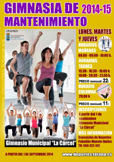 La Concejalía de Deportes pondrá en marcha el Programa de Gimnasia de Mantenimiento hoy lunes, día 1 de septiembre, en el gimnasio municipal del centro sociocultural "La Cárcel", con un amplio horario tanto de mañana como de tarde.
