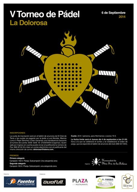 Como cada año, la Hermandad de Nuestra Señora de Los Dolores organizará, en las instalaciones del Club Tenis Totana, su tradicional Torneo de Pádel La Dolorosa. Este año el día elegido para la quinta edición del torneo es el SÁBADO 6 DE SEPTIEMBRE.