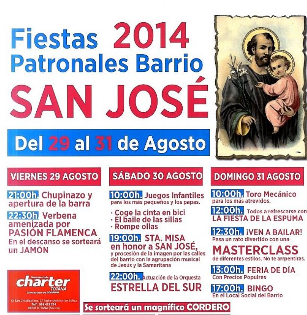 Las Fiestas de San José, organizadas por la Asociación de Vecinos de San José, arrancan este viernes 29 de agosto con un programa repleto de actividades deportivas, infantiles y musicales. Concretamente, el viernes se inaugurarán las fiestas a las 21:00 horas con el chupinazo y apertura de la barra y seguidamente habrá una actuación musical del grupo totanero "Pasión Flamenca".