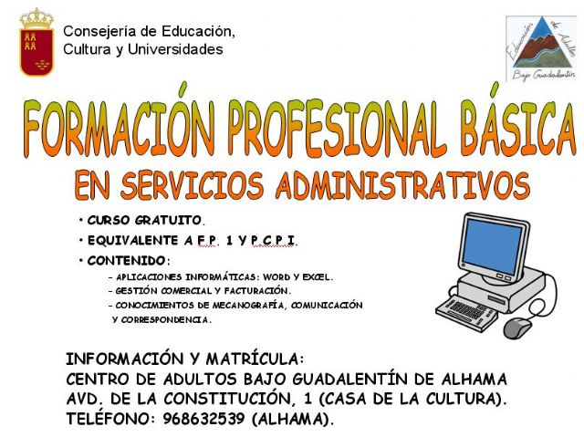La Concejalía de Educación de Totana informa de que está abierto el plazo para solicitar la matriculación en el curso de Formación Profesional Básica en Servicios Administrativos que se imparte desde el Centro de Educación Bajo Guadalentín en su sede de Alhama de Murcia.