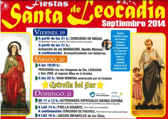 Las fiestas de "Santa Leocadia" se celebran este fin de semana, 19, 20 y 21 de septiembre, en horno a Santa Leocadia y San José. La organización de las fiestas ha planificado un fin de semana completo de actividades que arrancan el viernes a las 21:00 horas con un concurso de migas en el que se facilitará la harina y el aceite y que estará amenizado con la actuación de "Mariachis, Benito Moreno"