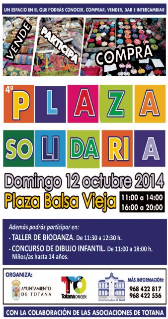 La Plaza de la Balsa Vieja de Totana acoge este domingo 12 de octubre el cuarto encuentro de asociaciones "Plaza Solidaria" a través del cual se volverá a ofrecer un espacio en el cual las entidades puedan vender, comprar e intercambiar objetos con el fin de autofinanciarse.