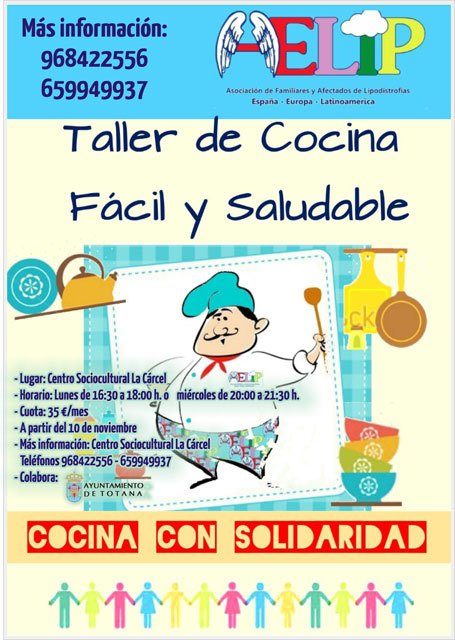 La Asociación de Familiares y Afectados de Lipodistrofias (AELIP) ha organizado, en colaboración con el Ayuntamiento de Totana, un Taller de Cocina "Fácil y Saludable" que tendrá un componente solidario ya que de la cuota de cada alumno se destinarán cinco euros a AELIP.
