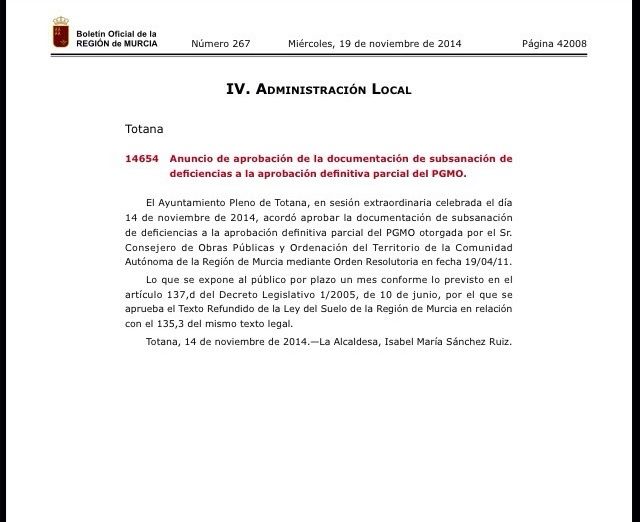 El Boletín Oficial de la Región de Murcia (BORM) publicó hoy, miércoles día 19 de noviembre, el anuncio de aprobación de la documentación de subsanación de deficiencias a la aprobación definitiva parcial del Plan General Municipal de Ordenación (PGMO).