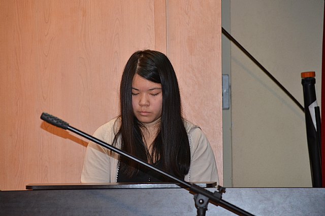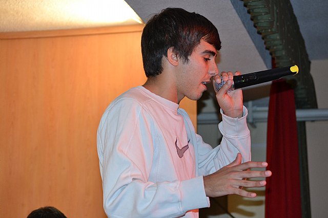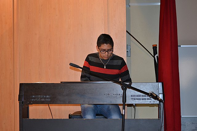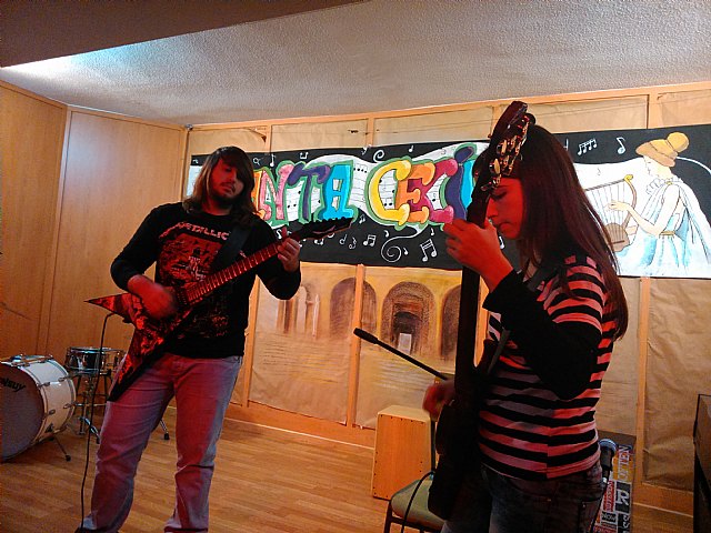 Todo ello culminó el viernes 21 de noviembre con el gran concierto que se celebró en el salón de actos del instituto, concierto del que se hicieron tres pases durante la misma mañana, para dar la posibilidad de asistir al mayor número posible de alumnos/as. Las actuaciones estuvieron protagonizadas por alumnos de todos los niveles de enseñanza, desde 1º de la ESO a 2º de bachillerato. La diversidad de estilos musicales fue enormemente variada. De esta manera, se pudo escuchar desde un rap, hasta música de rock duro, pasando por los evocadores sonidos del “Arabesque” nº 1 de C. Debussy. Tuvimos también la oportunidad de escuchar una preciosa canción interpretada por el grupo de alumnos de 1º A de la ESO, con letra y música creada por ellos mismos, como una iniciativa dentro de la clase de Lengua, de su profesora, Belén López. Alumnos de 3º de la ESO de la clase de Física y Química de la profesora Reyes Romero, sorprendieron a todos interpretando el himno de la alegría de Beethoven con copas y botellas. Con la intención de darle un carácter más pedagógico al concierto, además de incluir comentarios en cada una de las piezas interpretadas, se premió la atención del alumnado con el sorteo de un pequeño obsequio musical a aquellos alumnos/as que acertaran las preguntas de un sencillo cuestionario que se planteó al final de las audiciones.