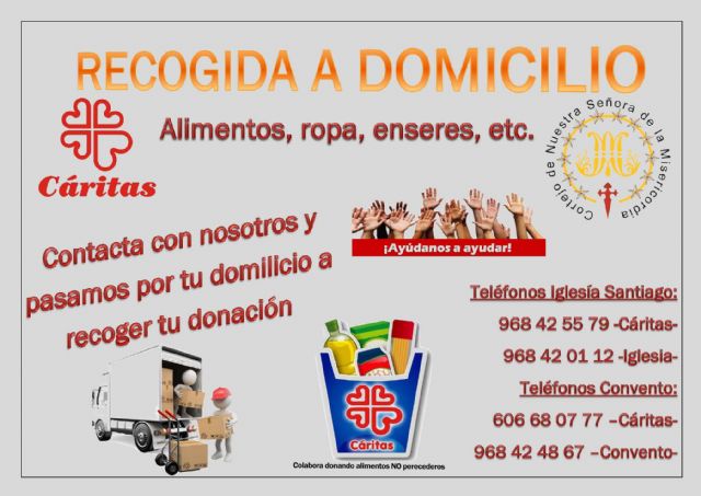 La asociación pública de fieles Cortejo de Nuestra Señora de la Misericordia, anteriormente denominada Cortejo de Nuestra Señora de la Soledad, en colaboración con Cáritas, pone en marcha un nuevo servicio de recogida a domicilio de alimentos, ropa, enseres, etc.