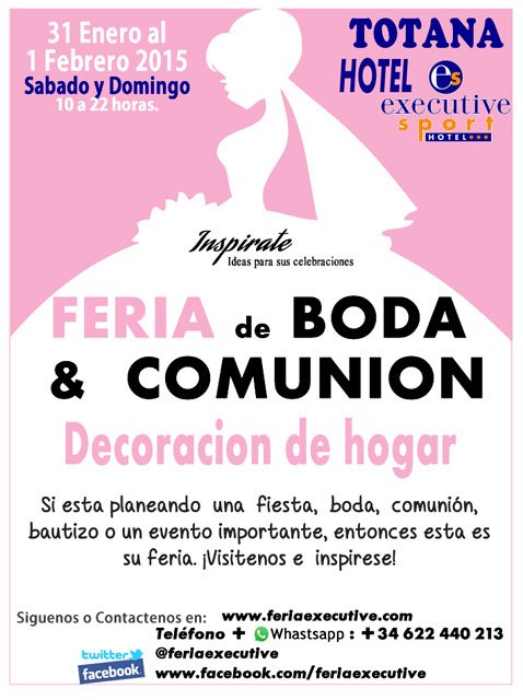 La primera edición de FERIA EXECUTIVE BODAS & COMUNIONES, organizada por HOTEL EXECUTIVE SPORT se celebrará del 31 de Enero al 1 de Febrero en Totana, contará con un completo programa de actividades, desfiles, exhibiciones, espectáculos y coctel que se desarrollarán en el marco de los expositores –pabellón1 y 2- en colaboración con diferentes empresas y agentes del sector. Un programa que, vendrá a complementar la amplia oferta expositiva del salón, y que abordará una variada gama de expositores donde podréis encontrar todo lo que necesitas para bodas, comuniones, bautizos, decorar tu nuevo hogar, detalles para tu boda, vestidos de novia, trajes para novios, photocall, DJ, Empresa especializadas en el sector de Repostería, detalles, fotógrafos, cortinas, hogar y una amplia gama de empresas con un gran atractivo tanto para visitantes como para las empresas participantes.
