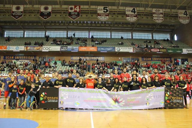 Las enfermedades raras tuvieron su protagonismo en el partido que enfrentó al UCAM Murcia CB contra el CAI Zaragoza en el Palacio de los Deportes de Murcia ayer domingo. La recaudación del encuentro de baloncesto se destinará a la Asociación de Enfermedades Raras D´Genes, para el mantenimiento del Centro Multidisciplinar "Celia Carrión Pérez de Tudela" ubicado en Totana gracias a la generosidad de la Universidad Católica San Antonio.