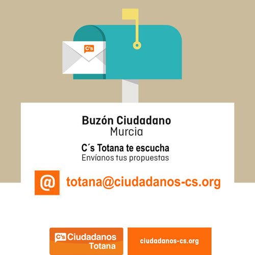 Desde la Directiva Local de CIUDADANOS en Totana quieren hacer participes directos a todos los totaneros del programa electoral que quieren presentar para las próximas elecciones municipales en nuestra localidad. Para ello, según informan desde la Directiva Local de Cs Totana, "tenemos nuestro BUZÓN CIUDADANO, a través de el podréis hacernos llegar vuestras propuestas directamente a esta Directiva para su estudio e inclusión en nuestro programa. También, caso de que lo veáis oportuno, nos podéis solicitar reunirnos para tratar el tema en cuestión. Al respecto, también comezaremos a  iniciar los contactos oportunos con las Asociaciones mas representativas de este Municipio. Por supuesto, también podéis a través de nuestros foros sociales plantearnos abiertamente lo que queráis que se debata públicamente si es ese el caso".
