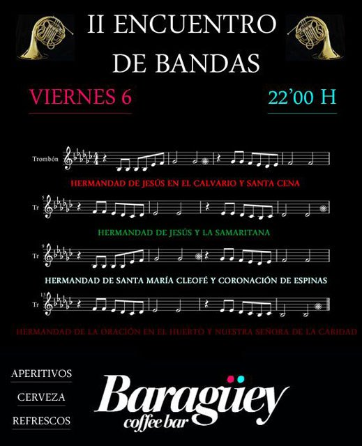 Baragüey Coffebar organiza el próximo viernes 6 de marzo el II Encuentro de Bandas, que tendrá lugar en la calle Don José María 6 de Totana, a partir de las 22:00 horas.