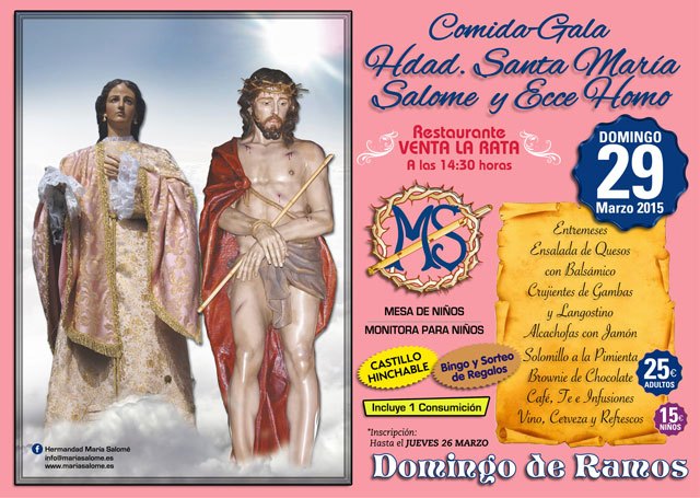 El próximo domingo 29 de Marzo, Domingo de Ramos, la Hermandad de Santa María Salomé y y Ecce Homo celebrará su tradicional comida en el restaurante Venta la Rata.