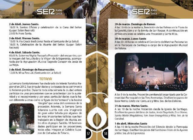 La Semana Santa de Totana vuelve a promocionarse, un año más, en una nueva edición de la "Agenda SER Nazarenos" que edita la emisora Radio Lorca Cadena Ser en la Comarca Guadalentín, y en la que se publicitan las procesiones y actos culturales y litúrgicos de las semanas santas de Lorca, Totana y Puerto Lumbreras.