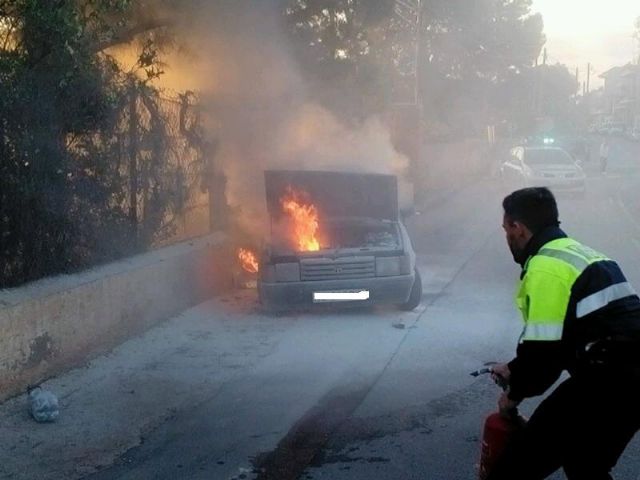 Bomberos del parque Alhama-Totana y agentes de la Policía Local de Totana sofocaron el pasado domingo, día 5 de abril, el incendio de un vehículo en la carretera de La Santa, en las proximidades de la zona de la Cruz de la Misión.
