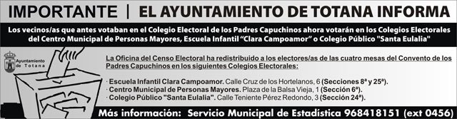 Los electores que votaban hasta ahora en el Colegio Electoral de los Padres Capuchinos de Totana quedan distribuidos a partir de esta cita electoral, y tras la desaparición de dicho colegio electoral, en mesas de los colegios del Centro Municipal de Personas Mayores, EI "Clara Campoamor" y CEIP "Santa Eulalia".