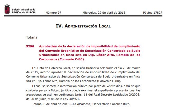Tal como recoge el Boletín del 29/04/2015 en su página 17827, la Junta de Gobierno Local del Ayuntamiento de Totana, en sesión Ordinaria celebrada el día 23 de marzo de 2015, acordó aprobar la declaración de imposibilidad de cumplimiento del Convenio Urbanístico de Sectorización Concertada de Suelo Urbanizable en finca sita en Dip. Lébor Alto, Rambla de los Carboneros (Convenio C-80).