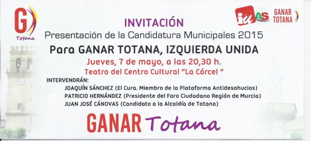 El acto de presentación de la Candidatura de  GANAR TOTANA, IZQUIERDA UNIDA  tendrá lugar el próximo jueves, 7 de mayo a las 20,30 horas en el Teatro de la Cárcel.