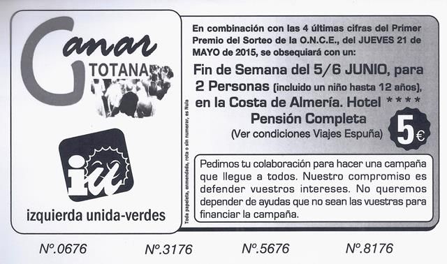 Como en las campaña electorales anteriores, GANAR TOTANA Izquierda Unida, ha iniciado una campaña para solicitar aportaciones de los vecinos y vecinas, con el fin de financiar su campaña electoral para las municipales que se celebran el 24 de mayo. En este caso, la Formación de Izquierdas, ha emitido unos bonos de 2 y 5 euros para que quien lo desee los compre y pueda ayudar a financiar la campaña electoral.