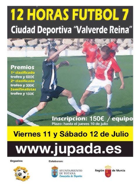 La Ciudad Deportiva "Valverde Reina" de Totana acoge los días 10 y 11 de julio las 12 Horas de Fútbol-7, cuyo plazo de inscripción finaliza este jueves, día 9, y tiene un coste de 150 euros por equipo y está organizado por el club "Jupada", según informan fuentes de la Concejalía de Deportes.