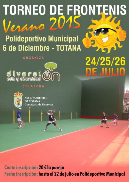 Los próximos días 24, 25 y 26 de Julio se organizará en el Polideportivo Municipal "6 de diciembre", el Torneo de Frontenis "Verano 2015", organizado por la Asociación "Diversión Ocio y Diversidad", con la colaboración de la Concejalía de Deportes.