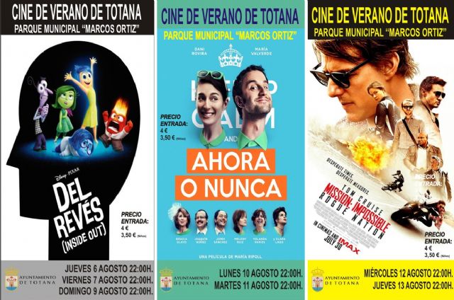 La Concejalía de Cultura informa de que el programa de Cine de Verano continúa este mes de agosto con la proyección de las películas "Ahora o nunca" los días 10 y 11 de este mes; y "Misión imposible", los días 12 y 13, respectivamente, a partir de las 22:00 horas todas ellas.