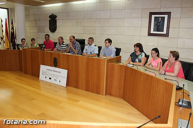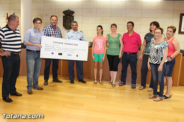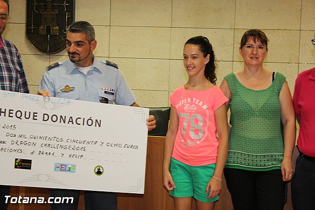 El alcalde de Totana, Juan José Cánovas, ha presidido el acto de entrega que ha realizado el comandante jefe del Escuadrón de Vigilancia Aérea EVA-13, Ricardo Acebal, de la recaudación de la Carrera Dragon Challenge “Memorial Subteniente Juan Carlos Pérez Calleja” a la Asociación de Enfermedades Raras D´Genes y la Asociación de Familiares y Afectados de Lipodistrofias (AELIP).