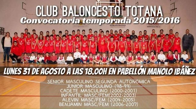 El lunes 31 de Agosto el Club Baloncesto Totana comienza una nueva temporada. Esperamos a todos los jugadores del año pasado y por supuesto, a todo el mundo que le guste el BALONCESTO y quiera practicarlo. Animamos a todos los interesados, tanto pequeños como mayores a que se pasen el lunes 31 por el pabellón Manolo Ibáñez a partir de las 18:00h.