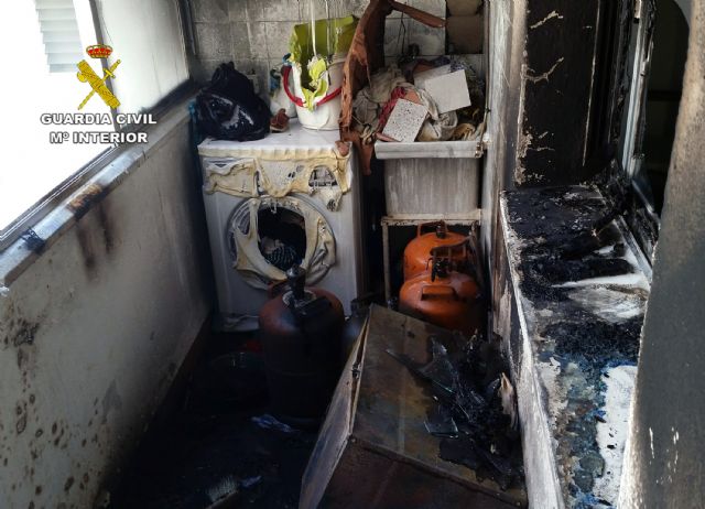 La Guardia Civil de la Región de Murcia ha evacuado y auxiliado a los moradores de una vivienda de Totana y a sus vecinos, tras producirse un incendio en el lavadero de un inmueble donde se encontraban tres bombonas de butano. El incendio fue extinguido por efectivos del Parque de Bomberos de Alhama de Murcia, sin tener que lamentar daños personales.