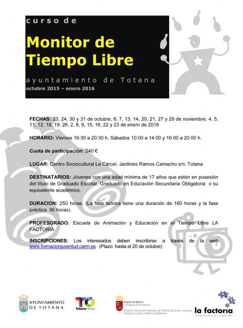 La Concejalía de Juventud oferta un "Curso de Monitor de Tiempo Libre" que se desarrollará desde finales de octubre y hasta enero del 2016, dentro del programa "La Cárcel Formación", y cuyos interesados deben inscribirse a través de la web www.formacionjuventud.carm.eshasta el 20 de octubre.
