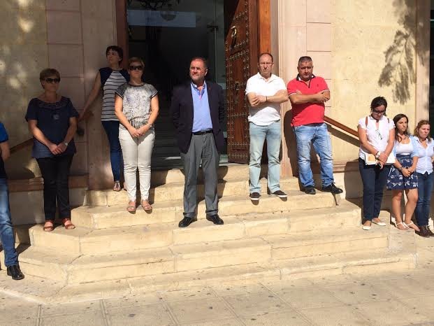 Representantes de la Corporación municipal de Totana y trabajadores públicos han guardado un minuto de silencio, a las doce en punto del mediodía, como señal de condena y rechazo por los tres últimos actos de violencia machista acaecidos en las últimas horas en diferentes lugares de España.