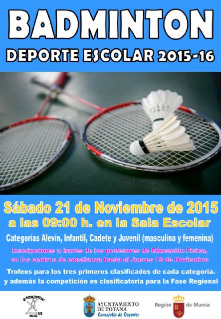 La Concejalía de Deportes tiene previsto organizar el próximo sábado 21 de noviembre en la Sala Escolar, la fase local de Bádminton de Deporte Escolar, a partir de las 09:00 horas de la mañana, en colaboración con el Club de Bádminton, dirigido a las categorías alevín, infantil, cadete y juvenil, tanto en modalidad masculina como femenina.