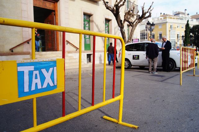 La parada municipal de taxis, que habitualmente se ubica junto al lateral de la parroquia de Santiago, se traslada durante una semana aproximadamente a la puerta principal del Ayuntamiento de Totana.