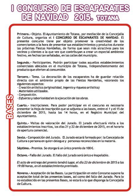 La Concejalía de Cultura va a organizar, a iniciativa de los participantes del grupo "Totana Cultural", eI I Concurso de Escaparates de Navidad "Totana´2015" con el fin de dinamizar, fomentar e impulsar el comercio de Totana.