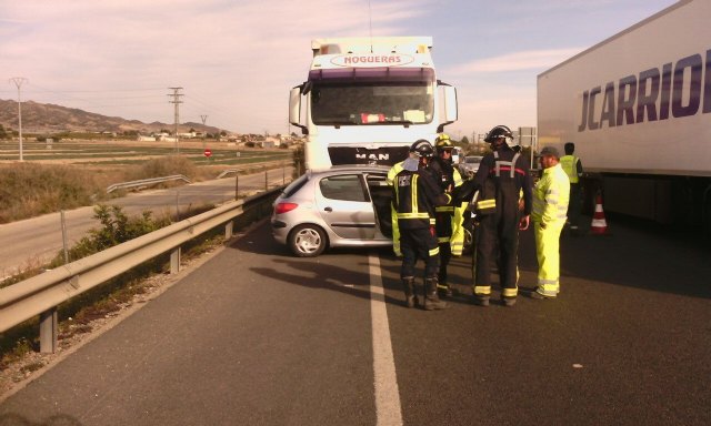 Guardia Civil, bomberos del Consorcio de Extinción de Incendios y Salvamento de la Región de Murcia (CEIS) y ambulancia con personal sanitario de la Gerencia de Urgencias y Emergencias Sanitarias del servicio Murciano de Salud han acudido a atender a la conductora de un turismo, que ha resultado herida y atrapada tras colisionar con un camión en la autovía A-7, en dirección hacia Andalucía, a la altura del término municipal de Totana.