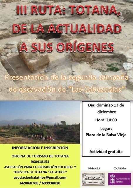 Gracias al éxito de las dos rutas anteriores, la Asociación Kalathos vuelve a organizar la ruta “Totana, de la actualidad a sus orígenes” para presentar los nuevos hallazgos y la evolución de los trabajos de excavación, gracias a la celebración de la segunda campaña de excavación en el yacimiento arqueológico de Las Cabezuelas (considerado el origen de la ciudad de Totana) durante el pasado verano.