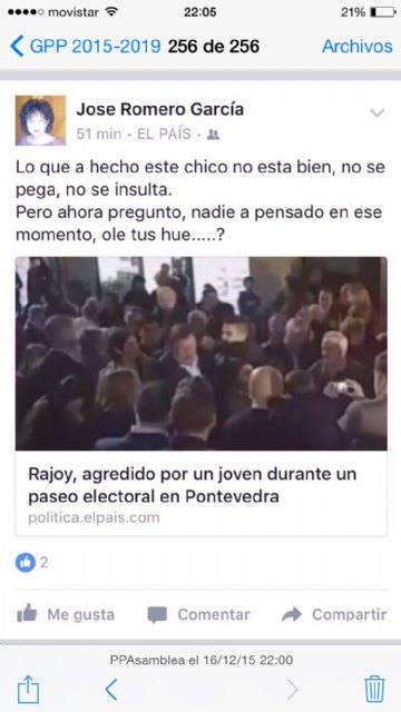 Para el PP, es una desfachatez que una persona que ha sido elegida por sus vecinos en las urnas y supuestamente los representa, justifique un acto de violencia sea quien sea la persona y haga comentarios que fomenten el odio, la violencia y el enfrentamiento entre vecinos y personas.