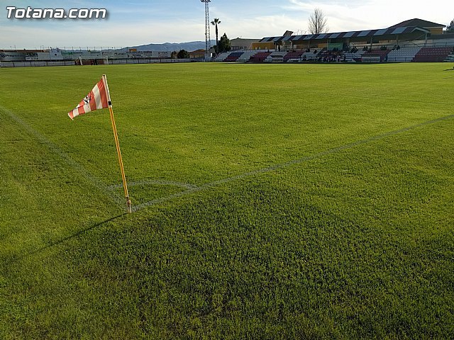 La Concejalía de Deportes del Ayuntamiento de Totana ha finalizado los trabajos de resiembra del césped natural del estadio municipal de fútbol "Juan Cayuela" de esta localidad, que ya luce con todo su esplendor para finalizar la temporada con garantías.
