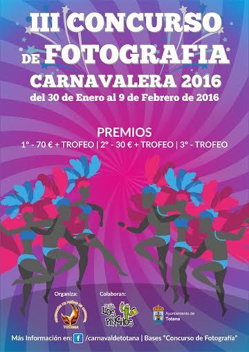 La Federación de Peñas del Carnaval organiza, con la colaboración de La Peña "Los Pinchos", el III Concurso de Fotografía Carnavalera´2016 de Totana, según informan fuentes de las concejalías de Cultura y Festejos.En el concurso pueden participar todas aquellas personas (mayores de 18 años) y podrán presentar las fotografías que hayan sido realizadas desde el 30 de enero al 9 de febrero de 2016, ambos inclusive, con un máximo de cinco fotografías por participante.