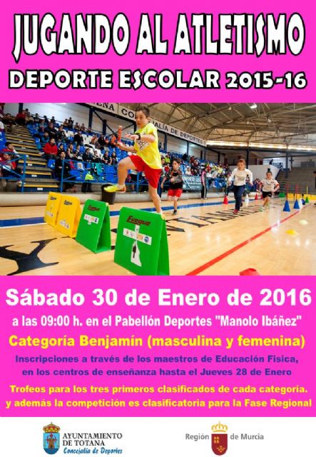 La Concejalía de Deportes informa de que mañana, sábado 30 de enero, este departamento tiene previsto organizar la Fase Local de Jugando al Atletismo de Deporte Escolar, en el Pabellón de Deportes "Manolo Ibáñez", a partir de las 9 horas de la mañana, donde participarán alumnos de todos los centros de enseñanza de la localidad, pertenecientes a la categoría benjamín.