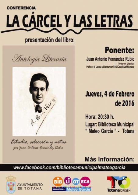 La Concejalía de Educación y Cultura ha organizado la conferencia "La Cárcel y las letras" y la presentación del libro "Antología literario de Antonio Para Vico. Estudio, selección y notas", que tendrá lugar el próximo 4 de febrero (20:30 horas) en la biblioteca pública municipal "Mateo García".