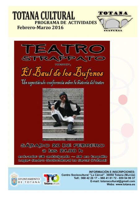 El sábado, día 20 de febrero, a las 21:00 horas, en el teatro del Centro Sociocultural "La Cárcel", se celebra el espectáculo-conferencia sobre la historia del teatro "El baúl de los bufones", cuyo precio de las entradas es de 5 euros por anticipado y 6 euros en taquilla.