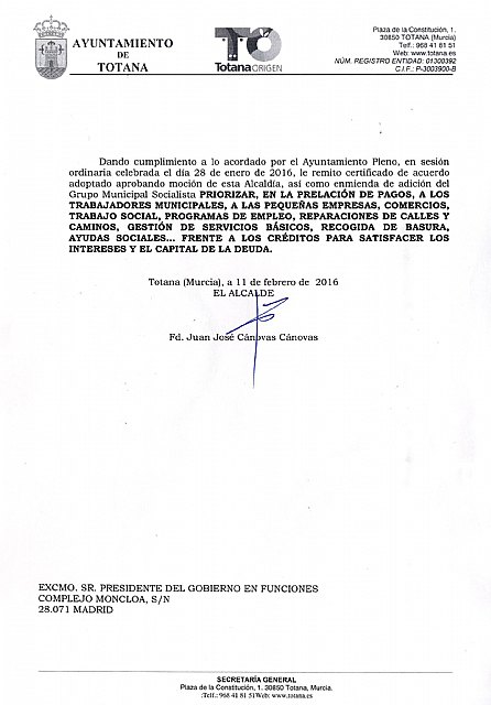 El pasado jueves, 11 de febrero, se dio traslado desde la alcaldía del ayuntamiento de Totana al presidente del Gobierno en funciones, del acuerdo de pleno adoptado en la sesión del 28 de enero. Acuerdo por el cual se aprobaba con 12 votos a favor y las 9 abstenciones del Partido Popular y Ciudadanos, "Priorizar en la prelación de pagos a los trabajadores municipales, pequeñas empresas, comercios, trabajo social, programas de empleo, reparación de calles y caminos, gestión de servicios básicos, recogida de basura, ayudas sociales… frente a los créditos para satisfacer los intereses del capital y la deuda".